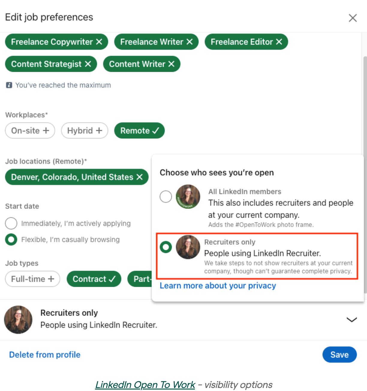 - Two visibility options: Recruiters Only (private) or All LinkedIn Members (public green badge)