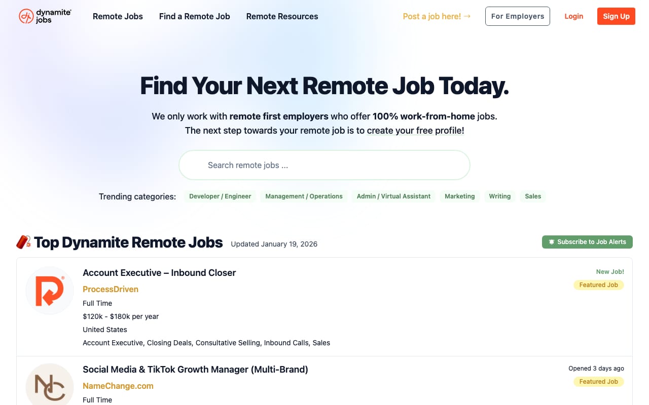 Created by the same founder as FlexJobs, Remote.co focuses exclusively on 100% remote positions—no hybrid roles. The site features company profiles highlighting remote work culture, Q&As with remote workers, and resources for transitioning to remote work. Quality over quantity, with curated listings from established remote-first companies.