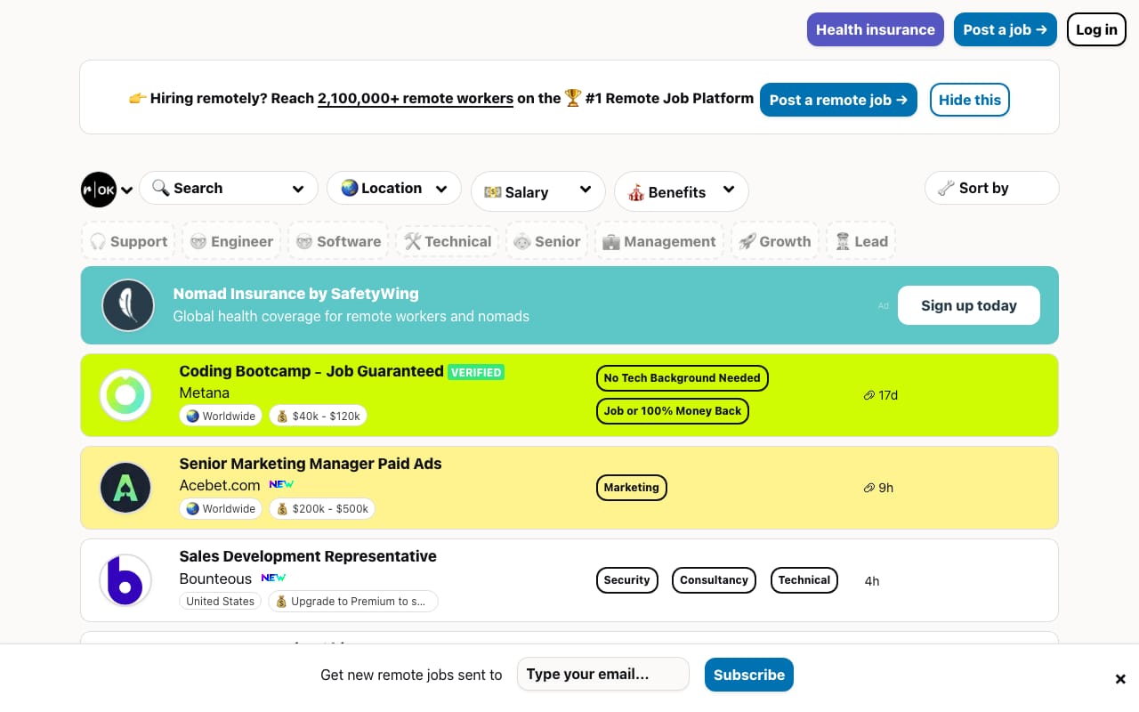 Remotive combines a job board with a community of 30,000+ remote workers. The weekly newsletter delivers curated remote jobs to your inbox, and the Slack community provides networking and advice. Job categories span engineering, product, design, marketing, sales, and support.