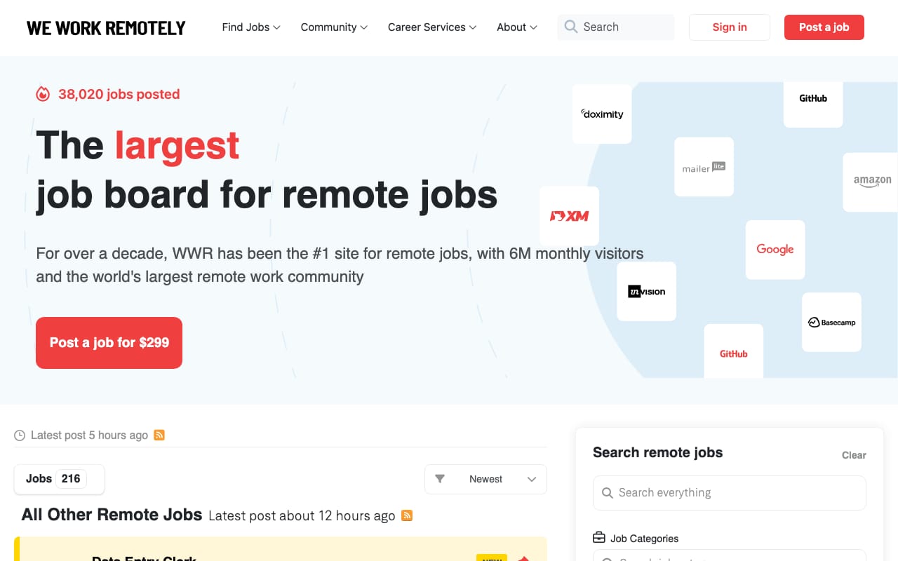 We Work Remotely is the largest remote-only job board, attracting 130,000+ monthly visitors. Founded by the creators of Basecamp, it focuses on tech, design, marketing, and customer support roles. The clean interface makes browsing effortless, and companies like GitHub, Zapier, and Automattic regularly post here. New jobs are added daily, and you can subscribe to category-specific RSS feeds.